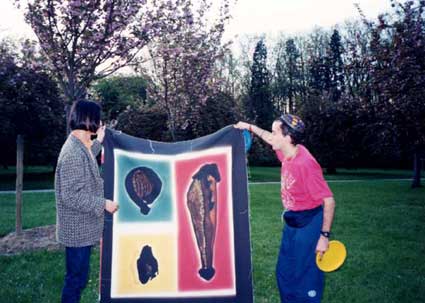 公園でトレーニング中のストリートパフォーマーと異種他流コミュニケーション.作品も持ち歩く道具にしてしまえば,まるでギニョールのようなメディアになる. |