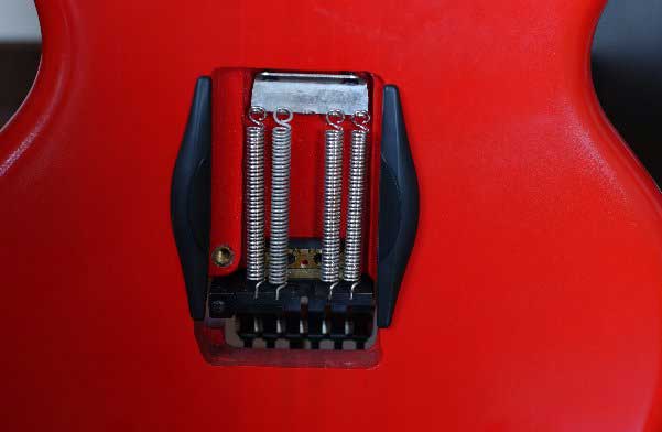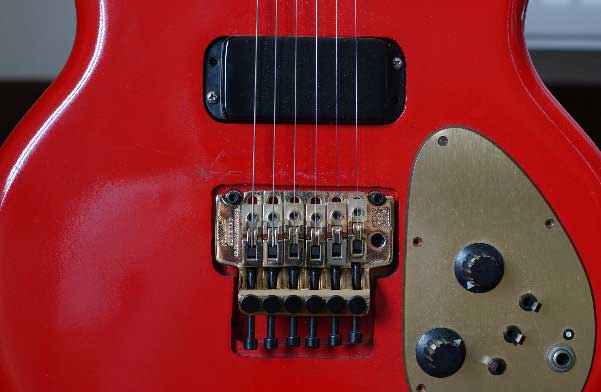 クリーンサウンドで鳴らした時,1弦の響きが他に比べてやや詰まるような気がした.そして,オリジナルのブリッジを無理矢理分解していじりだしたのが苦悩の始まり.ブリッジ駒を逆さにして新たに溝を削って装着しても改善なしで,いっそのことトレモロ式のブリッジ「ケーラー」に替えちゃえと決断する.ケーラーのローラーサドル・トレモロブリッジはボディー改造も少なくて済むし,ギブソン系のギターなどでは殆どボディー改造なしで装着出来,ケーラー仕様モデルも数種出回っていた.しかし,単体で買うには6,0000円もしてかなり高く,ショップで探してもなかなか売っていない.そんな時,ある不動産屋の前でワンルームオフィス「家賃7万円」が目にとまる.「ギターパーツとあまり変わらないじゃん」・・とんでもない飛躍をしてしまい,そこの不動産屋に飛び込んだ.「家賃7万円」は客釣りだったけど,勢いは収まらずだんだん欲も出てきて,結局ケーラー2個分のワンルームマンションに「オフィス・ヤナギ」開設.池袋東急ハンズから100メートルくらいのところだ.仕事にはとても便利なところで,それはそれで目出度い.このギターの役割はこれだったのかなと思うことにした.が,ギターの方も勢いが収まらないので妥協はしたが1万円くらいの国産ケーラーコピーモデルを装着した.それが良くないのかこのギターの苦悩は終わらない.トレモロを掛けるとサドルのローラーが軋むので,実戦には使用できない.さらに国産オリジナルのトレモロ・ブリッジに交換する.この時にはドリルとノミで結構ボディを削った.サスティンブロックの穴が見えてしまうので,自分で切り出したブラックのアクリルピックガードを装着する.トレモロは全くだめだったけど,ストップテールピースだと思えば問題はなかった.長らくこの状態であったが,銘木に縛られるのもいやだなとアーティスティックな野望が湧いてきて,ギターとして一番わくわく出来そうな赤にペイントすることを決断した.今度は使えるトレモロブリッジを絶対に付けるぞと,オリジナルフロイドローズを購入するはずが,何とフロイドローズライセンスの「ケーラー」を見つけてしまった.過去に買えなかったケーラー,フロイドローズのコピーのくせにオリジナルより高い・・が購入. |