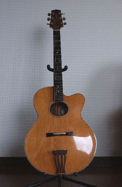 ボディーはスプルースのアーチドトップとバック・サイドがローズウッド,ネックはマホガニー.サウンドは響き渡る感じではなくてプンプンという感じ.粒立ちが良くて倍音は少ないと思う.アンプでも生でも非常に良いサウンド.ネックも安定していて調整した記憶がないし,純正の調整レンチも今ではどこに行ったのやら・・.プリアンプは超初期型でスライダーが二つだけのモノだけど,これってパット・メセニーが現在使用のギターにリクエストして装着しているらしい.フムフム・・.ローランドのJAZZ CHOURUS に繋ぐのだけど,まだステージで披露したことはない. |