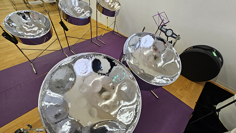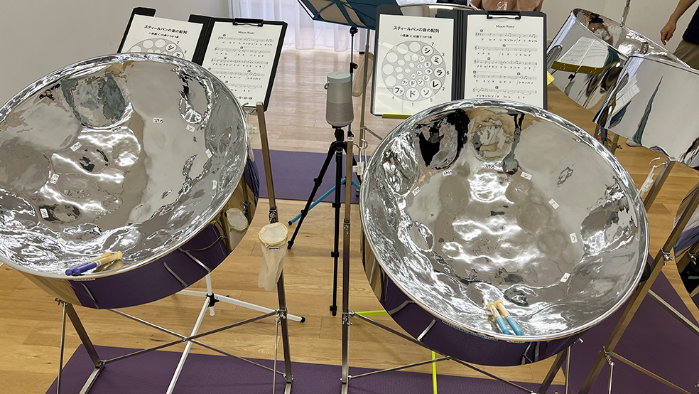 | 発表会前の練習風景.スティールパン・テナーベースのスティックの感触が良く魅入られ中です.不自由な左手が少し悲しく,心で涙しています・・. | ||