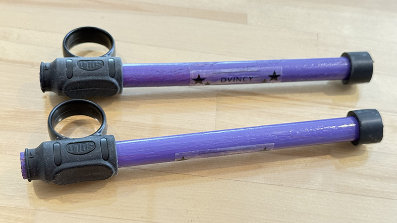 トリニダード・トバコ製のスティールパン専用スティック.樹脂製のグリップ補助具が装着されているので,私の麻痺が残る左手でもスティックの落下を防止できます. |